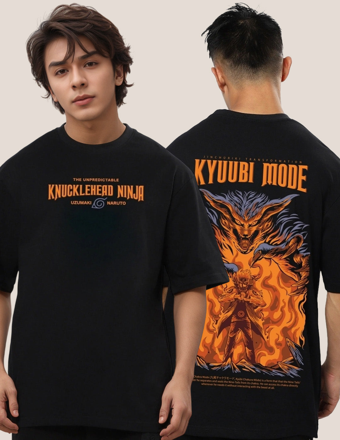Kyuubi Mode - Nine tail Fox Graphic Printed Pure Cotton Oversized Black T-shirt